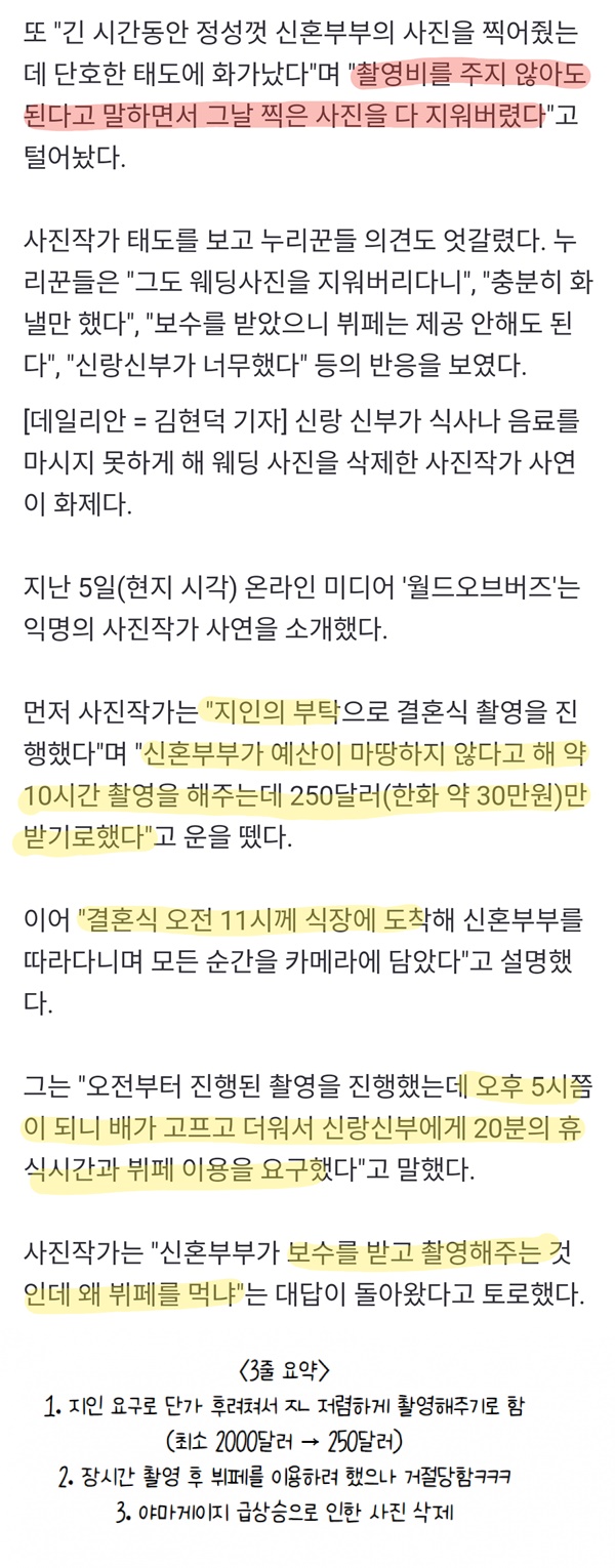 뷔페 못 먹어서 결혼식 사진 삭제한 사진작가 ㄷㄷㄷ